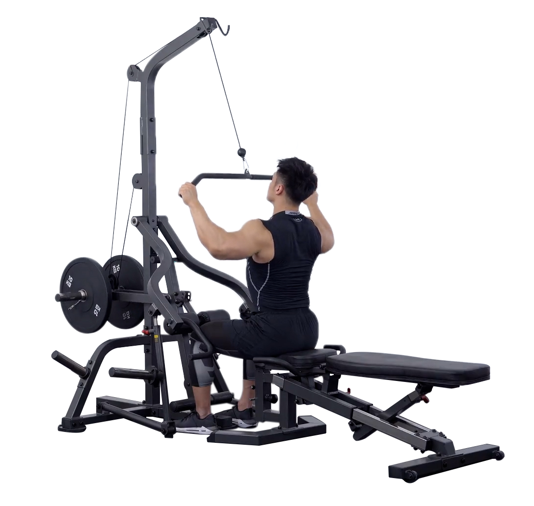 Lat Pulldowns primarily work the muscles of the back as well as the biceps. Before starting the bench may need adjusting which can be done using the red handle for its horizontal